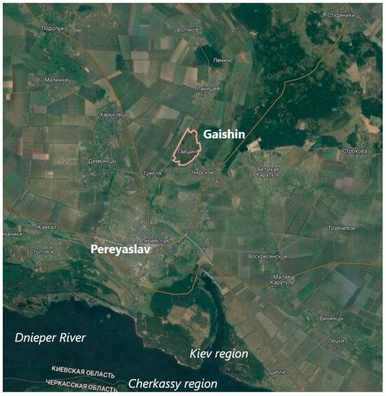 Satellite image of the Pereyaslavsky district of the city council (red dotted line—border of the village of Gaishin) (source—Google maps).