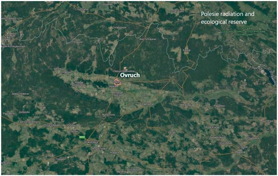 Satellite image of the Ovruch district (red dotted line—border of Ovruch city) (source—Google maps).