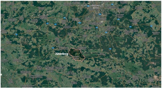 Satellite image of the surroundings of the city of Jüterbog (city border is highlighted with a red dotted line) (source—Google maps).