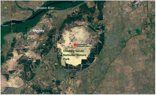 Satellite image of Oleshky Sands National Nature Park (image obtained from the Google maps internet service).