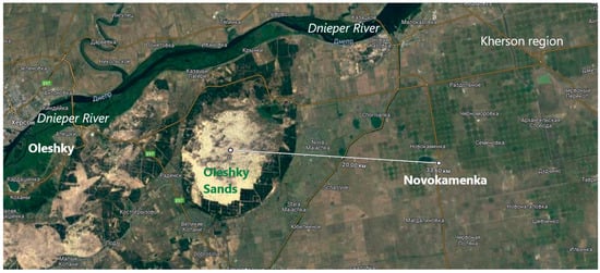 The “Novokamenka” site was additionally selected for research (due to the military conflict that began in this region in 2022). The new site is similar to the main one in its natural characteristics, located 33 km from the Oleshky Sands location. The new location is intended for irrigated agriculture (Figure 9).