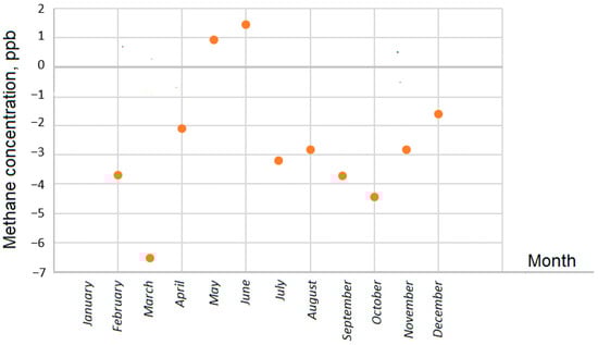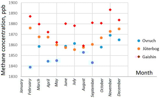 A possible explanation for the results in Figure 10 is the complex mechanism underlying methane interaction with plants, which can prevent its emission into the atmosphere through various mechanisms and, accordingly, this issue requires additional research. Figure 13 shows the averaged data for the Ovruch, Jüterbog, and Gaishin sites.