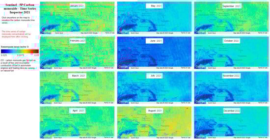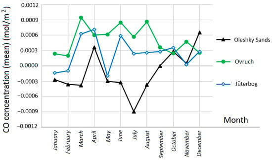 In Figure 13, the zones with low CO content correspond to the Carpathian and Alpine mountains, while the distribution of this greenhouse gas is relatively uniform in the rest of the territory. The fixation of high emissions in late winter and early spring coincides with the data obtained in the work of H. Yuan et al. [35] in urbanized areas of China. A promising future direction may be to compare CO emissions in different areas (Figure 15).