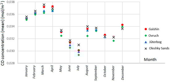Results of CO emissions analysis during 2022 for the locations Gaishin (a), Ovruch (b), Jüterbog (c), and Oleshky Sands (d).