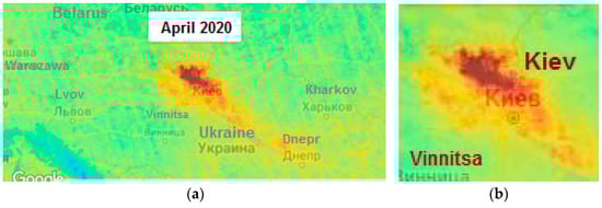 CO emissions in April 2020 due to a fire in the Chernobyl zone (a) and a test site to assess the impact of forest burning on an increase in CO content on the (b).
