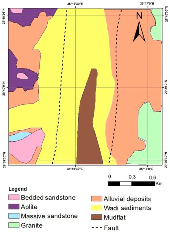 The geological evolution of the study area has been significantly influenced by multiple episodes of uplift and subsidence of the shield during exogenic processes. These movements have led to marine transgressions and regressions, resulting in the deposition of substantial sedimentary sequences [20,31]. The stratigraphic succession in the Wadi Rum area is generally presented in two distinct parts (Figure 3). The uppermost unit consists of quaternary surface deposits, primarily composed of alluvial and groups of wadi sediments, alluvium sand, and mud flats, with a thickness of up to several meters. Beneath this, the Rum Formation is exposed, comprising continental sandstone with a maximum thickness of approximately 1 km [26].