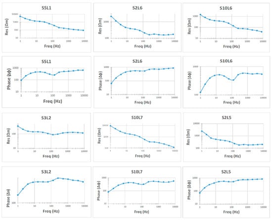 - Magnetic field phase (фH) measured in milliradians. This is defined as the phase between the transmitted signal and the measured magnetic field signal. In a homogeneous Earth model, this phase is typically equal to −π/4 rad in the far-field zone, where in the near-field zone it is equal to zero [50]. In the case of the transition zone, it has intermediate behavior. In a non-homogeneous Earth model, it has a complex behavior which explains the slope changes in the value of H.