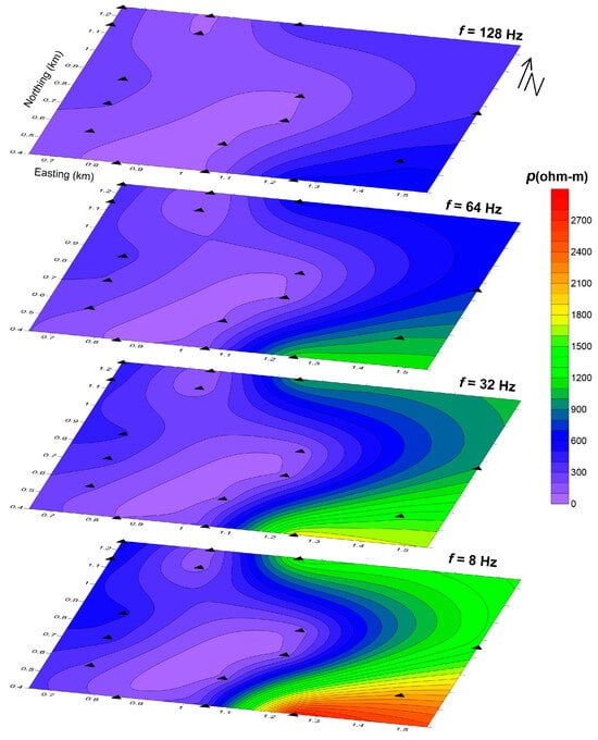 - The apparent resistivity is calculated from the well-known Cagniard equation [32] where the ratio of the electrical field and magnetic field can be obtained:The apparent resistivity (ρa) is expressed in ohm-meters, while (f) represents the frequency in hertz, (E) denotes the electrical field magnitude in millivolts per kilometer, and (H) indicates the magnetic field magnitude in gamma. It is important to emphasize that the Cagniard equation is applicable solely in the context of plane wave configurations for the electromagnetic field, which is characterized by a sufficiently large distance between the signal transmission source and the receiving location.