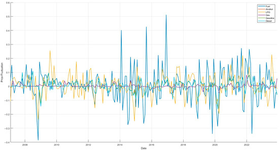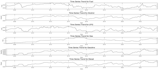 Six representative energy prices of fuel (FM), alcohol (AM), liquefied petroleum gas (LPGM), natural gas (NGM), gasoline (GM), and diesel (DM) are selected as energy market metrics in China. We selected OPEC production cut data and WTI crude oil prices as our exogenous variables. The sample data of energy variables are obtained from the CEIC database. The OPEC production cut data are treated as a binary variable, where a value of 1 indicates the occurrence of an OPEC production cut in a given quarter, and a value of 0 indicates that no such cut occurred. The data were carefully compiled from the OPEC Monthly Oil Market Report. Considering the policy background, changes in the market environment, and data availability, the spot prices of the above six energy sources from January 2007 to December 2023 were selected as the study sample (see Table 1 and Figure 1).