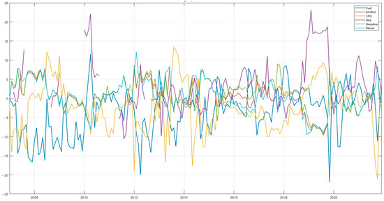 Secondly, around 2012, the energy markets once again exhibited the extremes of that period. The three markets of fuel, LPG, and natural gas reached the extreme values of this phase, and the three markets of alcohol, gasoline, and diesel reached the extreme values of this phase. This indicates that the three markets of fuel, LPG, and natural gas exhibit large risk spillover, while the three markets of alcohol, gasoline, and diesel are subject to large risk spillover.