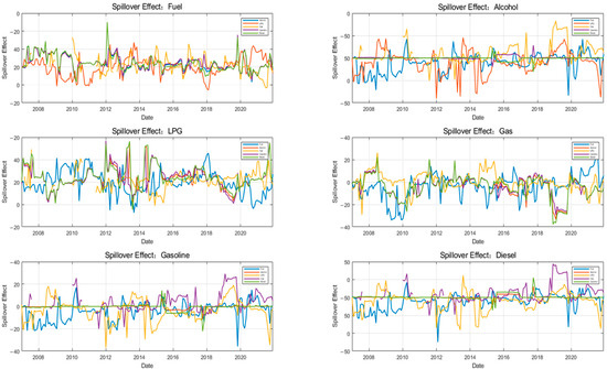 The overall volatility level of the energy market exhibits substantial fluctuations, ranging from −20% to 25%, and the total volatility spillover displays discernible time-varying characteristics. The total spillover level of the fuel market is more volatile, while the overall spillover level of the alcohol, gasoline, and diesel markets is similar, and the whole shows a flat state. The risk spillover of the natural gas market has a smaller range of fluctuations and a lower frequency of spillovers.