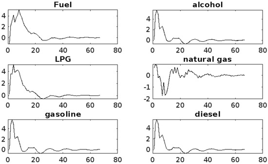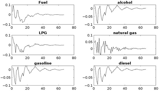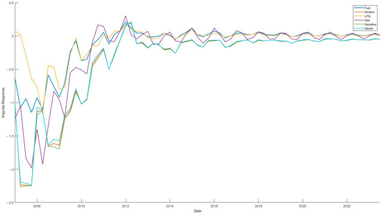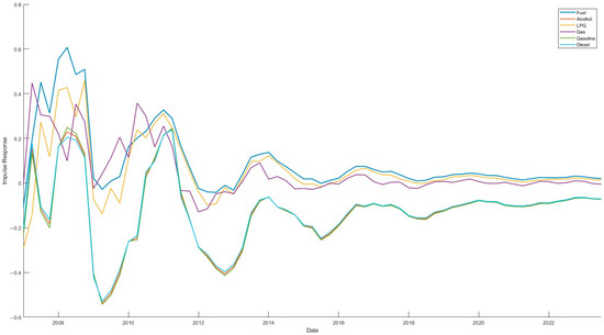 The overall impact of physical risk on risk spillover in the energy market is predominantly negative, with shock values predominantly below zero. Specifically, the overall trend of physical risk shocks to the three markets—gasoline, alcohol, and diesel—is similar, with impulse response values fluctuating between −2.5 and 0, reaching a maximum negative shock in period 3 and a minimum response in period 21, followed by a reduction in the magnitude of the fluctuations, which ultimately leveled off. This finding suggests that this market segment is particularly susceptible to physical risk, primarily due to the primary application of these energies as a means of transportation, a sector that is susceptible to the impacts of extreme weather events. For instance, extreme weather events can result in the disruption of transport routes, the closure of petrol stations, or sudden fluctuations in demand, which can influence prices and the balance of supply and demand within these energy markets [3].