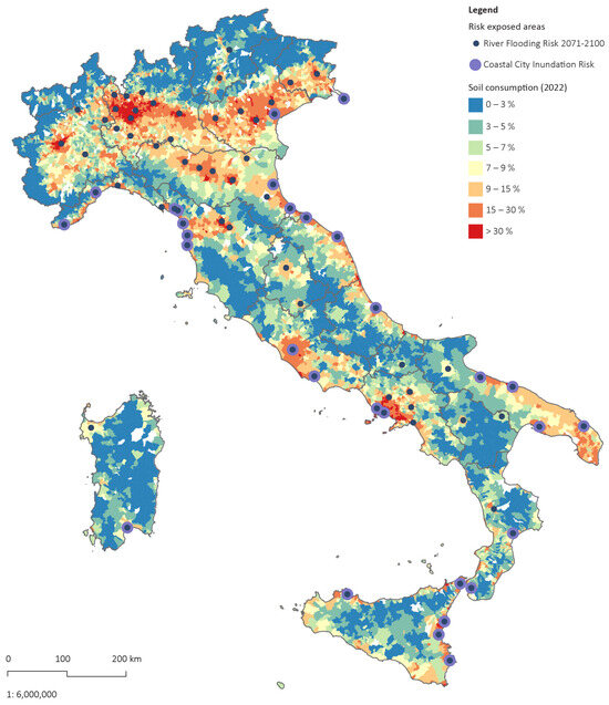Soil consumption (2022) related to risk exposure in terms of river flooding and coastal city inundation (2071–2100). Source: Livia Calcagni.