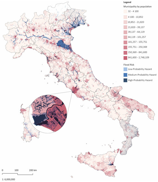 Mapping demographic distribution instead of land consumption provides information on the vulnerability of the different areas regarding the risk of loss of life, property damage, and economic disruption. Understanding population distribution is essential for informed urban planning and urban development decisions. The map in Figure 2 depicts the overlapping population distribution and flood risk. The red gradient shows the population distribution by municipalities: dark red areas have high demographic numbers. The data are taken from the ISTAT census 01/01/2023. The blue-gradient category returns three levels of flood risk: