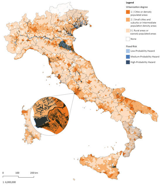 Leaving aside urban population in terms of demographic distribution, urban densification in the consolidated city and sprawling phenomena on fringe and rural areas have become a matter of investigation [30,32,33]. It is even more compelling to compare and overlap flood risk with the degree of urbanization, as shown in the map in Figure 3.