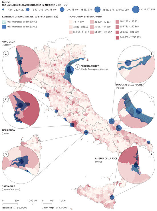 Map of sea level rise projections by 2100 (SSP.5-8.5) in Italy overlapped with demographic distribution by municipality. Source: re-elaboration by Livia Calcagni using data from ISTAT census 01/01/2023 and Climate Central Coastal Risk (IPCC 2021, SSP5-8.5).