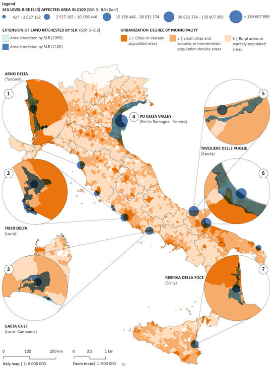 The maps in Figure 4 and Figure 5 provide information, respectively, on the co-existence of SLR projections and demographic distribution and of SLR and degree of urbanization. Therefore, the same map containing information on the degree of urbanization for Italian municipalities was superimposed on the risk of SLR. The map in Figure 4 represents the areas most subject to SLR with forecast scenarios for 2100 and their relation to demographic distribution. The map in Figure 5 shows the areas most subject to SLR with forecast scenarios for 2100 and their association with degree of urbanization. The forecast data are calculated considering the SSP5-8.5 scenario, according to which annual emissions will approximately double by 2050. The parameters considered for SLR projections include the following set-ups inserted in the Coastal Risk screening tool developed by Climate Central.