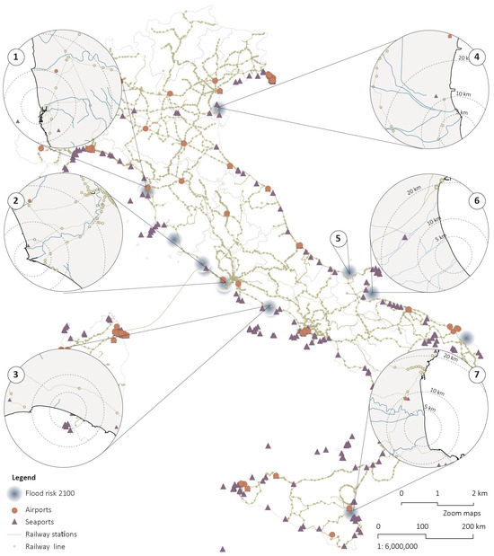 The area around Livorno (1) has a station within 5 km of reach, two seaports, and an airport within 10 km. The area between Fiumicino and Rome (2) has several train stations within 5 km of reach, a seaport within 10 km, and an airport within 20 km. The area in front of Gaeta (3) has several ports within less than 5 km, a train station within 10 km, and an airport within 100 km. The area around the River Po delta (4) has a station within 5 km of reach, a seaport 10 km distant, and an airport at around 70 km. The areas in the Province of Foggia (5 and 6) are not accessible by train station, as the closest train station is more than 20 km away. The closest seaport is within 15 km, and the closest airport is 100 km away. The area in front of Catania (7) has a train station, a seaport, and a port within 10 km of reach.