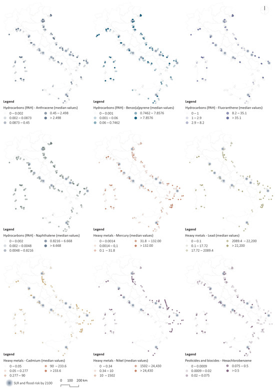 Water quality was also considered, especially regarding water contamination from hydrocarbons, heavy metals, and pesticides. Median values for anthracene, benzo(a)pyrene, fluoranthene, tributyltin, mercury, lead, cadmium, nickel, and hexachlorobenzene were extracted, normalized (Table 2), and compared (Figure 8).