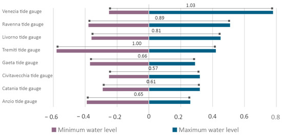 Data on the hydrographic level were extracted from the same database and used to evaluate and compare the water level fluctuations in each site (Figure 9). As shown in Graph 2, the highest water level fluctuation occurs in Venice (nearest buoy to area 4), where it reaches 1.03 m, followed by the Tremiti tide gauge (near area 6) and the Ravenna tide gauge (near area 4). The closest buoy to area 1 is the Livorno tide gauge, which registers a water level fluctuation of 0.81 m. The lowest water level fluctuation is registered by the buoy in Civitavecchia (0.57 m) near area 2. The other buoys register a water level fluctuation between 0.59 and 0.66 m.
