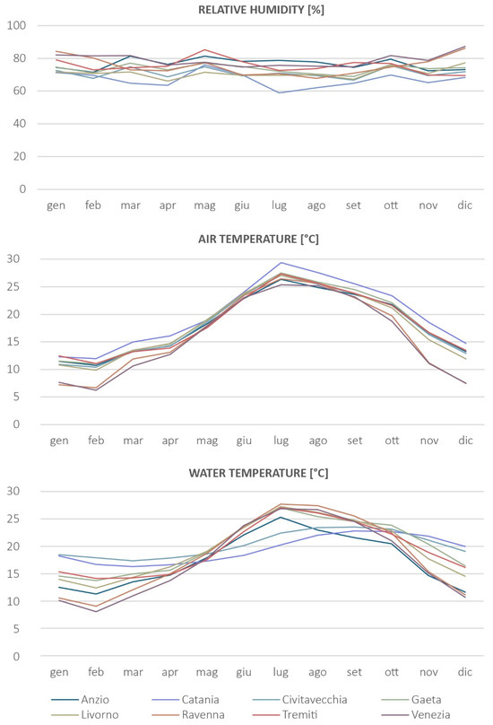 Data were extracted from the Rete Ondametrica Nazionale (RON) database for the year 2023. The accelerometer buoys that make up the national network managed by ISPRA represent an essential source of real-time meteorological data on wave height and direction and are freely accessible. Maximum humidity values are registered in the Tremiti buoy (area 6) and Ravenna (area 4), while minimum humidity values are registered in Catania (area 7) and Livorno (area 1). Regarding air temperature, the highest temperatures are registered in Catania (area 7) and the minimum ones in Ravenna (area 4). Water temperature range averages are similar in each buoy station, with low peaks in Anzio (area 2), Ravenna, and Venezia (area 4), yet never under 5 °C.