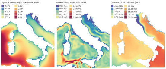 Energy potential parameters (wave height, current speed, and salinity) along Italian waterfronts. Source: re-elaboration by Livia Calcagni using data retrieved from webGIs portal developed within Maestrale EU Interreg MED 2014–2020.