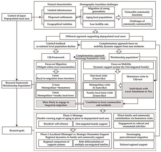 To effectively understand how to support sustainable aging amidst the challenges faced in Japan’s depopulated mountainous rural areas—where life is shaped by geographic isolation, dispersed settlements, infrastructure limitations [12], and reinforced cycles of economic and regional decline [31,32]—this study revisits and builds upon existing theoretical frameworks to provide new insights. This section integrates global and Japan-specific frameworks, as also summarized in Table 1, ultimately positioning the “relationship population” concept as a critical lens for understanding and sustaining rural support systems (Figure 1) while also exploring the potential of encouraging post-retirement migration through mobility-based hometown visits.