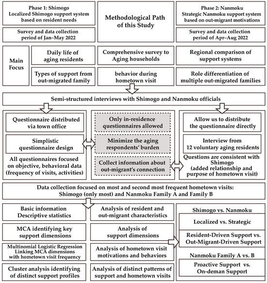 In this study, we adopted a comparative, mixed-methods approach to investigate the role of out-migrated family members in supporting rural community resilience, building upon findings from our Shimogo study (Phase 1) [52] and extending the investigation to Nanmoku (Phase 2). Figure 5 provides a visual overview of our methodological path, which began with an exploratory phase in Shimogo (Phase 1), followed by a comparative analysis in Nanmoku (Phase 2). This comparison was made to reveal how geographic proximity, migration patterns, and aging populations shape family support dynamics.