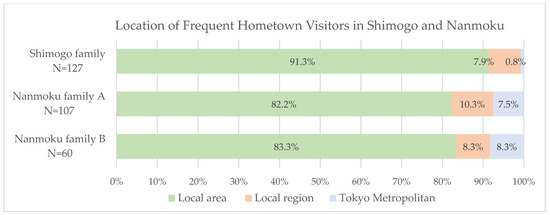 The contrasting forms of geographic isolation shape the kinship networks and patterns of hometown visits. Table 5 and Table 6 and Figure 6 demonstrate that in Shimogo, 91.3% of the most frequent visitors (monthly or more) were localized within the Aizu area, particularly Aizuwakamatsu City, illustrating a strong reliance on a localized support network. In contrast, Nanmoku had a more strategic pattern, with frequent visitors (Family A) roughly split between nearby Tomioka (28.6%), a locally accessible city, and Takasaki (28.6%), a major transportation hub with regional connections. Conversely, a greater proportion of less frequent visitors (Family B) from Nanmoku are found in the wider Gunma region (11.0%) or the more distant Tokyo Metropolitan Region (22.9%). Despite these differences in migration choices, both Shimogo and Nanmoku reveal evidence of sustained connections with hometowns through regular visits. Within Nanmoku, while children are the predominant family tie for both Families A (71.9%) and B (68.3%), suggesting their shared primary responsibility for familial support, siblings represent a significantly higher proportion of Family B (24.4%) compared to Family A (15.7%). While Nanmoku is located within the Tokyo Metropolitan area (“Kanto” Region), Figure 6 clearly demonstrates that it is primarily the regional connections within Seimou, not proximity to Tokyo itself, that are most strongly associated with frequent visits. Furthermore, while family reunions were the most reported purpose for visits (approximately 83%), Nanmoku Family A shows significantly higher involvement in practical support activities (chore support, farm work, and grave visits) than Family B, highlighting the multifaceted nature of their sustained engagement in family and community life.
