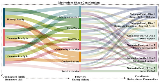 This section explores how the motivations of out-migrated family members shape their support contributions to Shimogo and Nanmoku. Building on the analysis of geographic isolation (Section 5.1), we used multiple correspondence analysis (MCA) [55,56,57,58,59], multinomial logistic regression (Table 7) [58], and a Sankey diagram [63] (Figure 7) to reveal that while Shimogo’s support networks are primarily a reflection of localized self-sufficiency and the expressed needs of its residents, the networks in Nanmoku are driven by the more diverse motivations and individual support preferences of its out-migrated relatives.