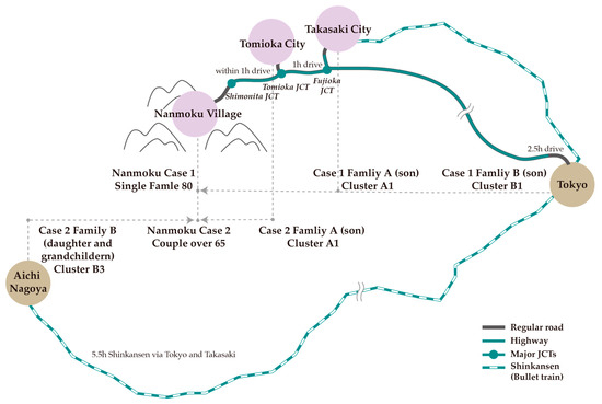 Nanmoku Village, also a depopulated municipality located in Gunma Prefecture, is situated within the Tokyo metropolitan area but remains isolated in terms of its geographical characteristics (Figure 3 and Figure 4). Surrounded by other depopulated municipalities (Kanna, Ueno, and Shimonita, for which Figure 4 contains more information) within Gunma Prefecture, Nanmoku is characterized by mountainous terrain and limited transportation infrastructure, necessitating a more strategic reliance on both local and regional connections to urban hubs. Located approximately 150 km from Tokyo, Nanmoku is accessible via the Kan-etsu and Joshin-etsu Expressways, requiring over 2.5 h of travel time (including 135 km on toll roads), and travel via national highways can take up to 5 h (Table 2 and Figure 3). Nanmoku’s economy involves small-scale farming and local produce (e.g., flowers and konjac), which are mostly sold in urban centers. Nanmoku has one of the highest aging rates in Japan and experiences predominantly local out-migration [48,51] (Table 2). While it is geographically closer to Tokyo, its mountainous terrain leads to more social isolation and limited accessibility. The out-migrants are more influenced by both regional and metropolitan connections.