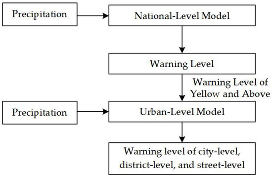 The EWS (Figure 2) first conducts national-level warnings, issuing warning levels for 231 cities. Subsequently, for cities with yellow or higher warning levels, urban-level risk warnings are carried out, resulting in risk warning levels for three types of administrative divisions: city-level, district-level, and street-level.