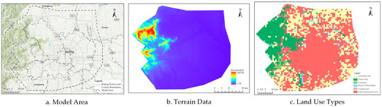 A two-dimensional hydrodynamic model was employed to simulate and forecast urban flooding in Beijing’s central districts. The study used a grid resolution of 30 m × 30 m to construct a two-dimensional surface hydrological–hydrodynamic model, generating approximately 4.66 million grid cells. Runoff parameters and surface roughness were assigned based on land use type data. The topography and land use distribution of the study area are illustrated in Figure 5b,c. The elevation data used in this study are based on the 30 m resolution ASTER GDEM V3 (https://www.gscloud.cn), and the land use data is sourced from the Resource and Environmental Science and Data Center, Chinese Academy of Sciences (https://www.resdc.cn).