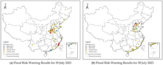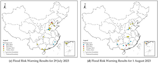 The forecast results from 29 July to 1 August 2023, are shown in Figure 9. Based on the actual flooding information, the five-day warning results were analyzed. The success rates for the warnings were as follows: red alert at 75%, orange at 80.77%, yellow at 49.45%, and blue at 38.46%. Among these, the success rates for blue and yellow alerts were relatively low. Analysis suggests that this may be due to shallow inundation or the use of emergency measures, such as mobile pump stations, by relevant authorities to quickly drain the water, minimizing the impact on residents’ daily lives and production. As a result, there were no related reports on these instances.