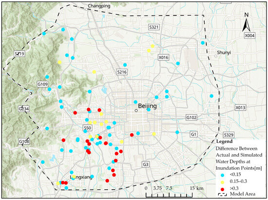 Based on the measured heights of the flood traces, the maximum water levels at 88 flooding points within the study area were collected, and the measured water depths were compared with the maximum inundation depths calculated by the model (Figure 11). Among these, 53 inundation points, where the difference between the measured and simulated depths did not exceed 15 cm, accounted for 60.28% of the total points. There were 68 inundation points where the difference did not exceed 30 cm, representing 77.27% of the total points. The predicted inundation points were largely consistent with the actual conditions.