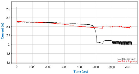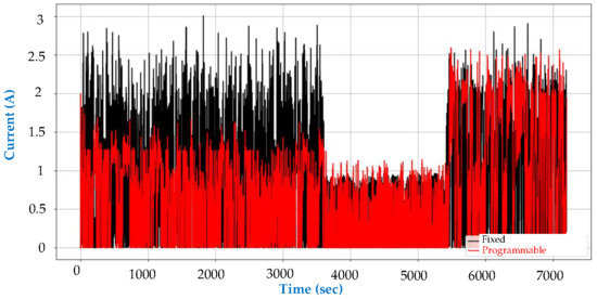 Compared to previous studies, covered in Section 1, which primarily focused on hybrid storage without programmability, this study uniquely integrates a programmable charge controller, dynamically optimizing charge–discharge cycles. Unlike fixed controllers that operate under predefined settings, our approach allows real-time adaptation, leading to a 69% improvement in the mitigation of current fluctuations with batteries only. This contribution extends the practical applicability of effective storage in renewable energy systems. Figure 4 highlights the impact of incorporating a supercapacitor in parallel with the batteries in the fixed charge controller’s energy storage system (black curve: batteries only; red curve: batteries + supercapacitor). Under varying light conditions, the supercapacitor responds rapidly to sudden changes in the load, effectively mitigating transient fluctuations. This quick response reduces the strain on the batteries, preventing abrupt current draws. By addressing these rapid changes, the supercapacitor not only minimizes internal stress on the batteries but also improves overall system efficiency.