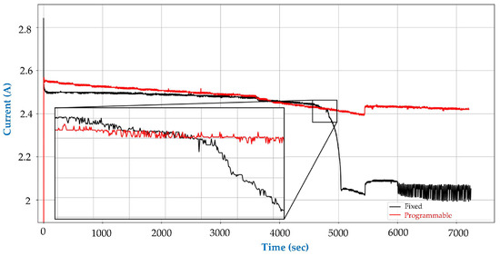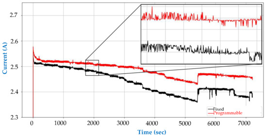 Figure 2 illustrates the current waveform of the output from both the fixed (black curve) and programmable (red curve) charge controllers operating without an energy storage system. To quantify the current fluctuations, the THD values were analyzed to assess waveform quality. The fixed charge controller demonstrated a THD of 71.775%, whereas the programmable charge controller achieved a reduced THD of 66.838%, further emphasizing its superior performance in minimizing distortions and enhancing system stability. The variations observed in Figure 2, particularly the differences in current fluctuations at distinct time periods, can be attributed to the dynamic nature of solar irradiance and the adaptability of the programmable charge controller. Before 3500 s, the fixed charge controller exhibits larger current magnitudes with significant fluctuations, whereas the programmable charge controller maintains lower current levels with smoother waveforms, demonstrating its ability to optimize power delivery. Between 3500 s and 5500 s, both controllers exhibit similar current magnitudes, indicating a phase where the programmable controller’s adaptive algorithm operates near the fixed controller’s response. However, after 5500 s, both controllers experience an increase in current magnitude due to higher irradiance levels from the LED lighting system. Despite this, the programmable charge controller continues to demonstrate less fluctuation compared to the fixed controller, as can be more clearly observed in the next figures, highlighting its superior ability to stabilize power flow. This experimental observation confirms that the programmable charge controller effectively mitigates power fluctuations under varying irradiance conditions by dynamically adjusting charge–discharge cycles in real time.
