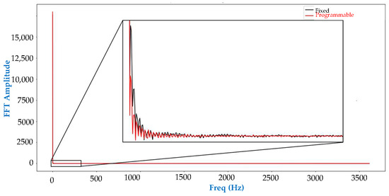 Finally, Figure 6 depicts the frequency content of both charge controllers when used with the batteries and supercapacitors. While the standard deviation provides insight into the spread of the curves, this spectral plot highlights the harmonic content and its impact on fluctuations. The vertical axis represents the amplitudes of the frequency components obtained through the Fast Fourier Transform (FFT), indicating the magnitude of current oscillations at specific frequencies (measured in Hz, shown on the horizontal axis). This analysis reveals the contribution of different frequency components to the overall waveform. The fixed charge controller (black curve) exhibits overall larger amplitudes at lower frequencies compared to the programmable controller (red curve), demonstrating the programmable charge controller’s effectiveness in mitigating the influence of frequency content. To further analyze the impact of the programmable charge controller on frequency components, the amplitude of dominant harmonic components was quantified. The fixed charge controller exhibits the peak harmonic amplitude at 1 Hz, whereas the programmable charge controller reduces this by 42.01%, demonstrating superior harmonic mitigation. This confirms that the programmable charge controller effectively suppresses lower-order harmonics, improving overall power quality.