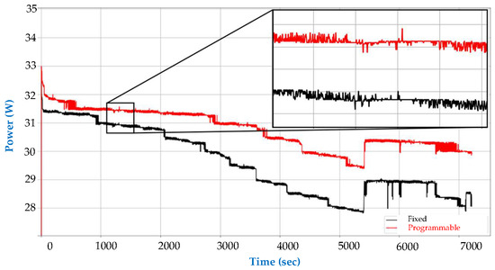 Finally, Figure 7 illustrates the power delivered to the load using both the programmable and fixed charge controllers. As observed, under varying lighting conditions, the programmable charge controller, working in conjunction with the supercapacitor, responds more effectively by providing greater power output. Notably, after 5500 s, it demonstrates a more significant mitigation of power fluctuations, particularly when the LED lights in the lab are further dimmed to better emulate more dramatic cloudy conditions.