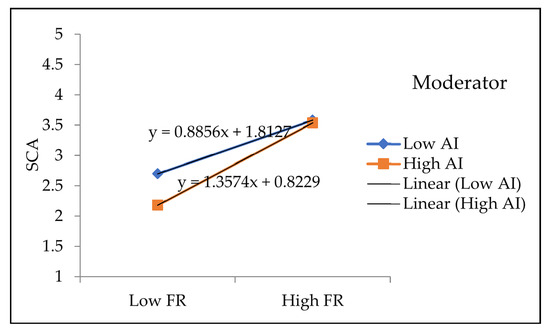 Figure 2 demonstrates the pattern of interaction between financial resources and SCA. It illustrates that financial resources are stronger when the adoption of AI is higher, and that higher AI adoption is more likely to achieve higher SCA. In other words, AI adoption strengthens the positive relationship between FRs and SCA.