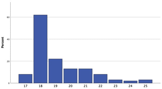 The population consisted of 167 students from the Faculty of Education and Tourism at the University of Salamanca. These students were enrolled in the Bachelor’s Degree in Primary Education, the Bachelor’s Degree in Early Childhood Education, or the Double Bachelor’s Degree in Primary Education and Early Childhood Education. All students were in the first year of their academic training, ensuring a similar level of academic preparation. The selection of this cohort at such an early stage guarantees a homogeneous exposure to pedagogical concepts related to CT. This control over the sample allows for a deeper understanding of their baseline knowledge, perceptions, and potential gaps in their preparation. The sample consisted of 134 participants: 54 were studying for a Bachelor’s Degree in Early Childhood Education (40.3%), 59 for a Bachelor’s Degree in Primary Education (44%), and 21 for a Double Bachelor’s Degree in Primary Education and Early Childhood Education (15.7%). In terms of gender, the sample consisted of 36 males (26.9%) and 98 females (73.1%). The mean age of the sample was 19.19 years, with a standard deviation of 1.803 (Figure 1).