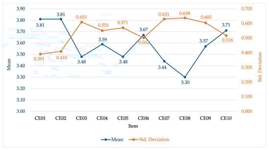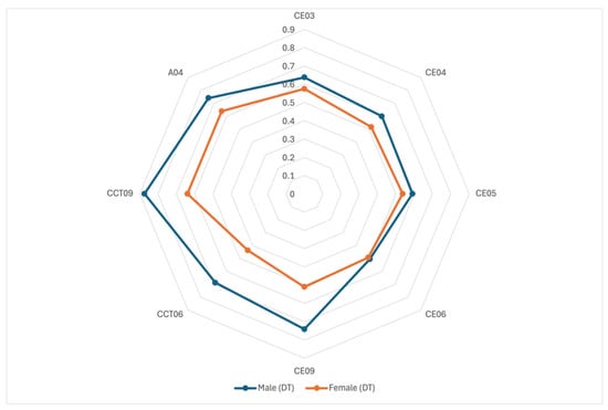 Regarding item CE03, the differences may be attributed to the possibility that women are more accustomed to organising tasks systematically due to social roles that have traditionally assigned them responsibilities in planning and management across various contexts. Consequently, this tendency may extend to the academic environment and their future professional engagement in integrating CT into the teaching–learning process.