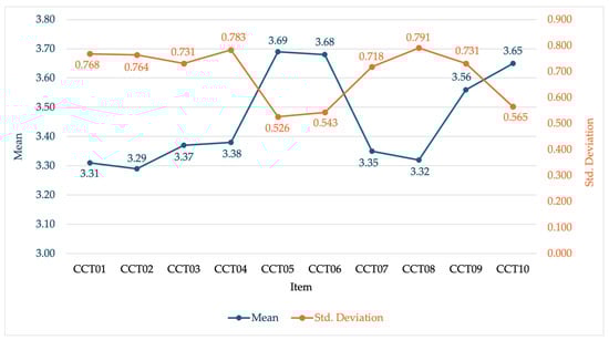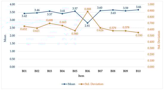 Regarding the last dimension, which refers to the benefits of integrating CT and programming into the teaching–learning process, the items again obtain scores above 3. There is only one exception, item B06, which refers to the fact that CT and programming can be integrated in the teaching–learning process without the need for computers whose mean was 2.81. On the other hand, the items with the highest scores are B08 and B10, with 3.65 and 3.66, respectively. Item B08 indicates that teachers are a key element in facilitating the teaching of CT and programming, and item B10 emphasises how CT allowed learners to develop essential abilities for effectively using tech tools.