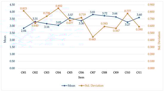 The results obtained in the dimension related to the objectives of integrating CT and programming into the teaching–learning process show that the mean scores of most of the items are placed at values higher than 3. This indicates that the pre-service teachers agree or strongly agree with the objectives indicated in the items. There is only one item of this dimension that reaches a lower value, specifically item O01 with a mean score of 2.84. That means that pre-service teachers have little agreement that one of the aims of CT and programming is to inspire students to pursue careers in science-related fields in the future. On the contrary, the items with the highest scores are item O07, to improve digital competence, and item O08, to develop problem-solving strategies and enhance self-confidence when tackling complex projects with multiple potential solutions. These items obtain averages of 3.81 and 3.72, respectively.