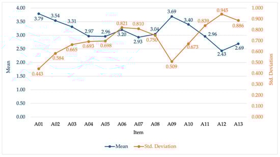 On the other hand, the items A04, A05, A07, A11, A12, and A13 receive scores between 2 and 3. The items A12 and A13 stand out as having the lowest scores with a mean of 2.43 and 2.69, respectively. These items refer to the pre-service teachers’ knowledge of teaching computing principles such as decomposition, etc., in the classroom, and being able to grasp fundamental computing concepts such as algorithms, etc., to tackle problems effectively. This illustrates the pre-service teachers’ perception of their knowledge about teaching and understanding some concepts related to CT.