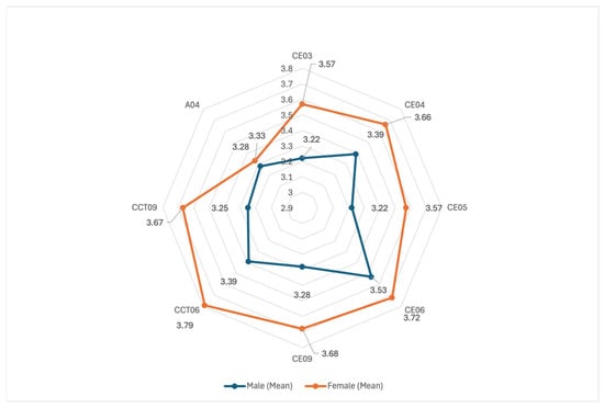 In terms of gender differences (Figure 7 and Figure 8, Table 2), significant differences were found in eight items corresponding to the dimensions: competences related to children’s education (CE), competences related to CT (CCT), and pre-service teachers’ attitudes towards CT and programming (A). In all cases, women scored higher on average than men. These items refer to break down a complex task into smaller, manageable steps and determine the most efficient sequence (CE03), to be autonomous in addressing and completing the assigned tasks (CE04), to choose and use digital devices and applications effectively for task completion (CE05), to actively seek, compare, and select digital information, considering diverse sources and contexts (CE06), to evaluate the potential risks of using digital tools, considering factors like security and identity (CE09), to actively seek, compare, and select digital information, considering diverse sources and contexts (CCT06), to evaluate the potential risks of using digital tools, considering factors like security and identity (CCT09), and to be confident in my access to the necessary resources and training regarding programming and CT content in education (A04). Low intensity is observed for most of the factors, with medium intensity for items CE09 and CCT06.