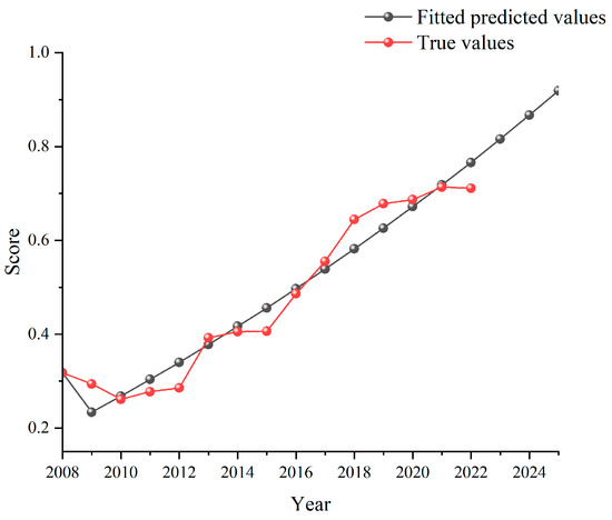 Based on the results from Formula (12), the GM(1,1) grey model was used to forecast the sustainable development level of Qinghai Province for 2023 to 2025. After the data series was transformed through translation, the ratio test yielded values between [0.882, 1.133], indicating that the data are suitable for model construction. The post-error ratio C value was 0.048 (≤0.35), and the error probability p-value was 1, suggesting that the model has a high accuracy level. The average relative error of the model was less than 10%, indicating a good model fit. Using the formula in reference [28], the development coefficient a = −0.0276 and the grey operation amount u = 1.1807 were obtained, yielding the following forecast model: