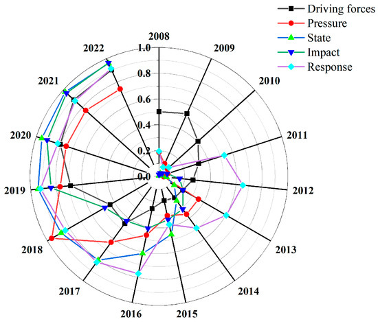 The comprehensive sustainability scores for Qinghai Province from 2008 to 2022, calculated using the entropy weight–TOPSIS model, are presented in Figure 1. Each data point represents the overall sustainability score of the province. Based on the grading criteria in Table 2, the sustainable development of Qinghai Province can be divided into three phases: from 2008 to 2013, the province was in a weaker phase; from 2014 to 2017, it was in a moderate phase; and from 2018 to 2022, it progressed to a stronger phase. Before 2010, there was a downward trend. However, from that point onward, the sustainability score continuously increased, showing a fluctuating upward trend, rising from 0.318 in 2008 to 0.711 in 2022. The scores for each subsystem are presented in Figure 2. From 2008 to 2022, the scores for the five subsystems—driving forces, pressure, state, impact, and response—within the sustainable development evaluation system of Qinghai Province gradually increased. Between 2008 and 2010, the driving force system had the highest score. From 2011 to 2017, the response system led the sustainable development progress in the province. In 2018, the pressure system achieved the highest score, while from 2019 to 2022, the scores of the state and impact systems were similar, leading the overall performance. Compared to the sustainable development phases of Qinghai Province, the early weaker phase relied primarily on economic growth, with insufficient attention given to the development of other systems. In the moderate phase, the government began implementing proactive policies and adjusting development strategies, resulting in more coordinated development among the various sustainability systems. In the later stronger phase, the continued efforts of the state and response systems maximized the coordination of all sustainability systems in Qinghai Province, further enhancing the province’s overall sustainable development capacity.