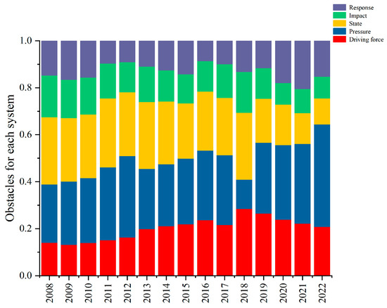 Using Formula (15), the obstacles for each system in Qinghai Province from 2008 to 2022 were calculated. As shown in Figure 3, government policies regulated the ecological, environmental, and economic systems, facilitating their stable development. The impact of human production activities on these systems has gradually decreased, leading to a reduction in the obstacles affecting the systems. Over the past 15 years, the pressure and state systems have been the primary barriers to sustainable development in Qinghai. In recent years, the obstacle in the state system has gradually declined, with the pressure system emerging as the dominant barrier. To better understand the distribution of obstacles across the indicators, we ranked the obstacle degrees of 25 indicators from Qinghai Province over the past 15 years in descending order. The analysis of the top eight indicators each year is presented in Table 4.