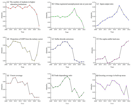 According to Table 3, the nine main obstacle factors influencing sustainable development in Qinghai Province from 2008 to 2022, identified using a frequency threshold of 6, were as follows: the number of students in higher education institutions (X13), the urban registered unemployment rate at year-end (X16), the input–output ratio (X2), the proportion of GDP from the tertiary sector (X15), sulphur dioxide emissions (X8), per capita arable land area (X11), forest coverage (X10), trade dependency ratio (X3), and greening coverage in built-up areas (X22). These factors occurred with frequencies of 14, 14, 12, 10, 10, 10, 9, 8, and 7, respectively. Clearly, these 9 factors are the primary barriers to sustainable development in Qinghai over the past 15 years. Further analysis of the trends in these key barriers is shown in Figure 4.